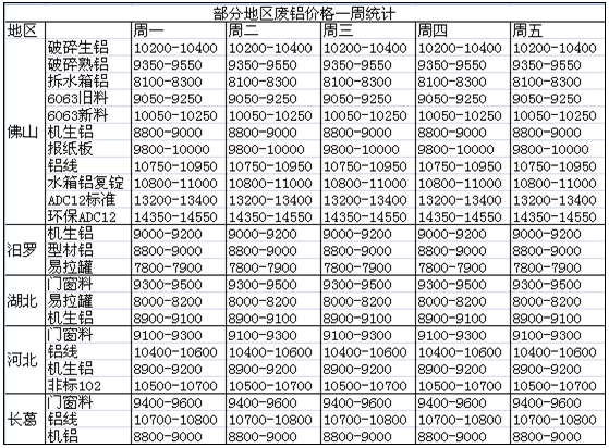 华南地区:本周华南地区铝锭价格走势略好于华东地区,截至周五华南地区铝锭带票价格在12460-12560元/吨之间,较上周五上调30元。现货市场,本周华南地区持货商出货较积极,换月前下游企业和中间商多观望,采购不多,换月后,持货商坚挺售价,下游企业和中间商逢低开始接货,市场成交尚可。