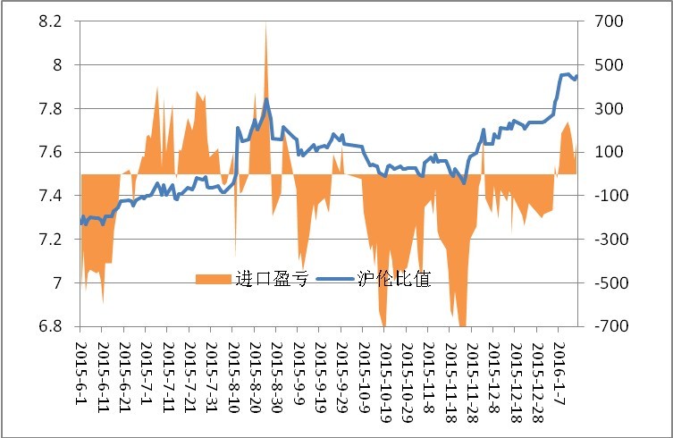 本周国内现货铜随期铜出现连续性下滑,虽然有国储局收储消息,但并未能阻止价格下滑。供应方面,本周出现转折点,上半周供应一直保持较为充足,但铜价连续下跌过后持货商开始惜售,尤其是的进口供应商。国产铜供应因收储及减产等早已销声匿迹,而支持市场供应的主要为进口铜,但本周人民币开始企稳,虽然因内强外弱行情进口小幅盈利(见图1),但套汇利润空间缩小,进口铜也跟着减少。货源减少后,现货铜升贴水开始回升,沪期铜也开始逐步回稳。而下游方面,本周接货意愿也被低廉的铜价所激发。因下游多数加工厂定于本周交割过后开始休假,在休假前低位吸收作为库存。从厂家备库量上看,仍旧偏谨慎,因担心后期价格继续下跌。在供需两方面的转变下,铜价甚至出现反弹回升,但下周市场正式进入休假状态,消费或再度走淡,预计反弹空间比较有限。