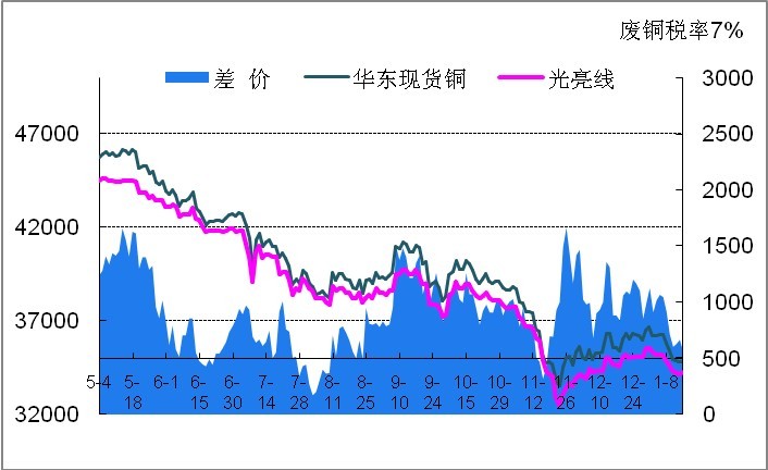 临近春节,商家惜售情绪较浓;加之市场上货源较为稀少,商家看涨春节后铜价,因此少量库存不肯出售。而铜厂方面,继续收货,但也有部分铜厂在价格下跌之时,停止收货。据富宝铜研究小组调研发现,北方市场因天气原因较为冷清;南方市场相对较好,但也在逐渐变冷清,有些铜厂或大货场已经考虑提前放假。从目前的精废差价来看,维持在500-1000元之间。这对铜厂的诱惑力不大,废铜的价格优势不明显,因此,需求并未有所放大。