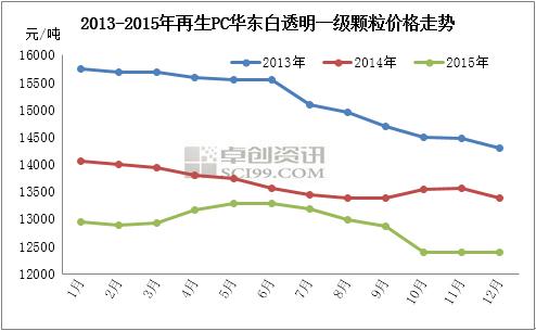 从近些年走势整体来看,再生PC属于抗跌性较强的再生塑料种类。但从上图不难看出,以华东白透明一级颗粒为例,近三年中该等级整体顺应大宗商品价格走势呈现下行。2015年该等级月度均价整体在12400-13300元/吨区间震荡,年内峰谷值差在900元/吨;2013年该等级月度均价在14300-15750元/吨,与2015年的价差为1900-2450元/吨,年内峰谷值差在1450元/吨;2014年该等级月度均价在13400-14050元/吨,与2015年的价差为750-1000元/吨,年内峰谷值差在650元/吨。
