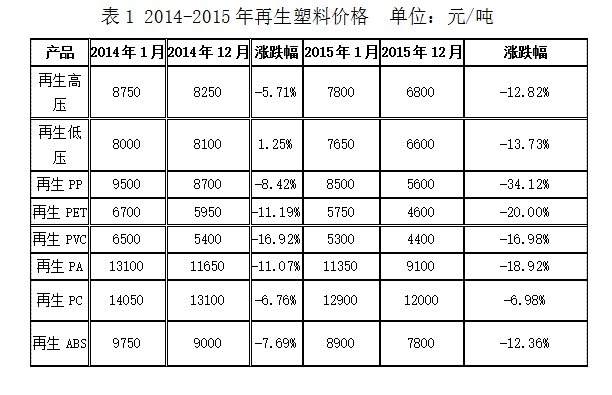 从表1可见,2015年再生塑料产品全面下行,其中再生PP、再生PET跌幅在20%以上。主要因为,原油骤降后在2015年一直维持低位震荡,且再生PP、再生PET下游注塑、拉丝、化纤行业作为传统制造业库存压力较大,且属于劳动密集型低附加值行业,整体利润狭窄,下游需求尤为清淡。在新料节节大幅跳水后,回料价格优势不复存在,导致此类产品价格面临暴跌行情。就再生PP而言,今年下降2900元/吨,年度跌幅高达34.12%,截至目前业者处于亏损状态,整体开工率也较往年低1-2成。其他产品,如再生PE高低压、再生PC、再生ABS等下游分布较广,可用于注塑、拉丝、吹膜、吹塑等,风险趋于分散,价格相对承压,因此本年度跌幅相对处于中低水平。就再生PE高压而言,今年下降1000元/吨,降幅在12.82%,而新料却走低2000-3000元/吨,属于抗跌产品。