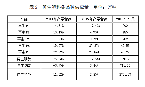 表2 再生塑料各品种供应量 单位:万吨