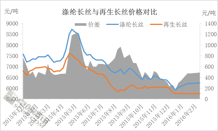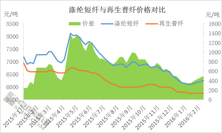再生聚酯对原生聚酯的替代性主要体现在化纤方面,传统意义上认为,原生化纤比再生化纤售价高1000元/吨以上,下游厂家对再生化纤的采购偏好将明显增强。然而国际原油暴跌后新料原生化纤由于成本下滑售价降低,再生聚酯却因为再生瓶片回收成本固定,难以随油价波动而灵活调整,因此销售优势荡然无存,产品售价跌跌不休。