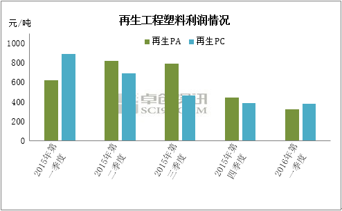 由上图可见,再生工程塑料产品利润呈现逐渐缩窄趋势,2016年第一季度利润水平达到最低水平,不足400元/吨。主因为:长期的疲软行情和微薄利润使得场内毛料供货商积极性受挫,年前毛料库存储备不足,年后货少行情持续时间较长,毛料货紧价高,但再生料价低难涨,再生厂家利润再受挤压。